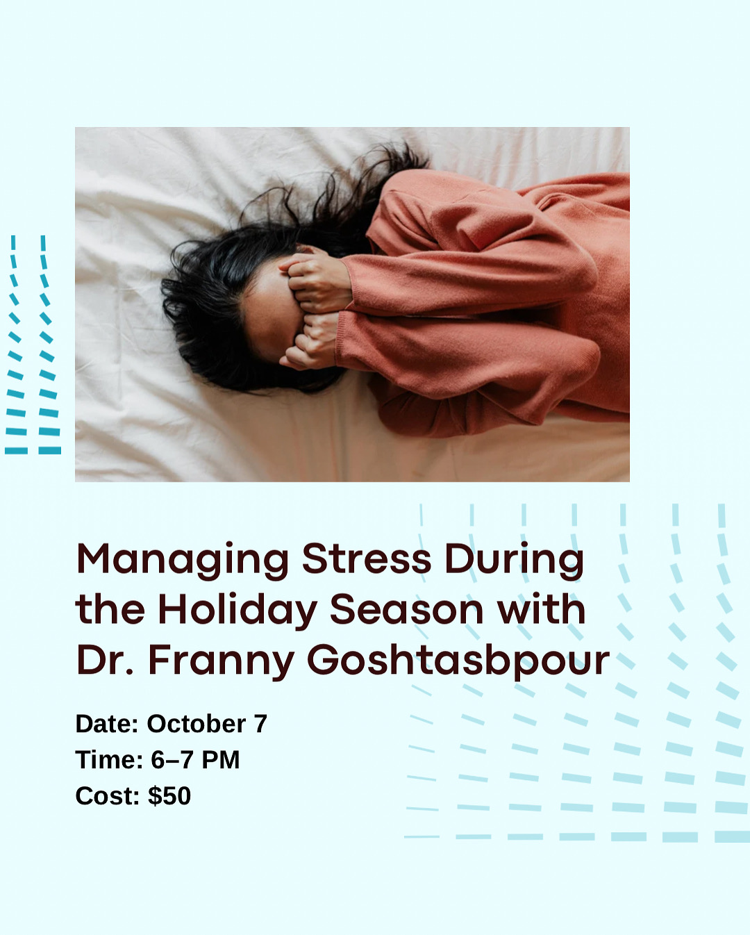 The holiday season can bring joy, but it can also bring overwhelm. Join Dr. Franny Goshtasbpour for an engaging, interactive workshop designed to help you navigate the stresses of the season with balance and ease.